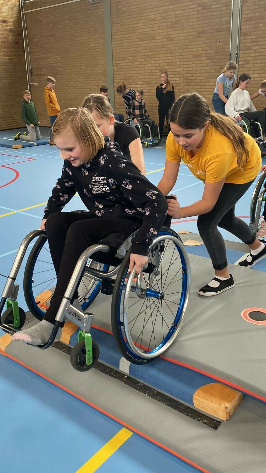 Na de les in de klas kwam voor de kinderen het moment om in de gymzaal zelf te oefenen in de lichtgewicht en buigzame rolstoelen. Dat viel zeker niet mee en ook hier werd duidelijk dat je elkaar in de wereld echt moet helpen.